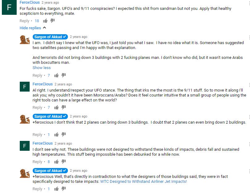 As if Sargon’s claim that he “creates rock-solid arguments backed up by reason, evidence, and logic” could be made more risible, he is also a 9/11 “truther.” Benjamin once wrote that “terrorists did not bring down three buildings with two planes man. I don’t know who did, but it wasn’t some Arabs with boxcutters man”. He also described the women who accused Harvey Weinstein of harassment and assault as “gold-digging whores who … didn’t (accept Weinstein’s advances) or did and regretted it”. He added that he had no doubt Weinstein “did things that would comprise assault” but added that “(actresses) shouldn’t go along with it just for a paycheck!” The point of this article is not that Sargon has never made coherent videos or that he should be banned from YouTube. The point is that Sargon of Akkad is a tribalist who has such an aversion to policy discussion that he dismisses all evidence that indicates that the far right can be as noxious as the far left. He is not a “skeptic,” a “lefty,” a “classical orator,” or a better alternative to the chicanery of mainstream news outlets. He is a McCarthyite with a pet issue that he will spin into endless, repetitive, biased content for his selectively-outraged fan base.
